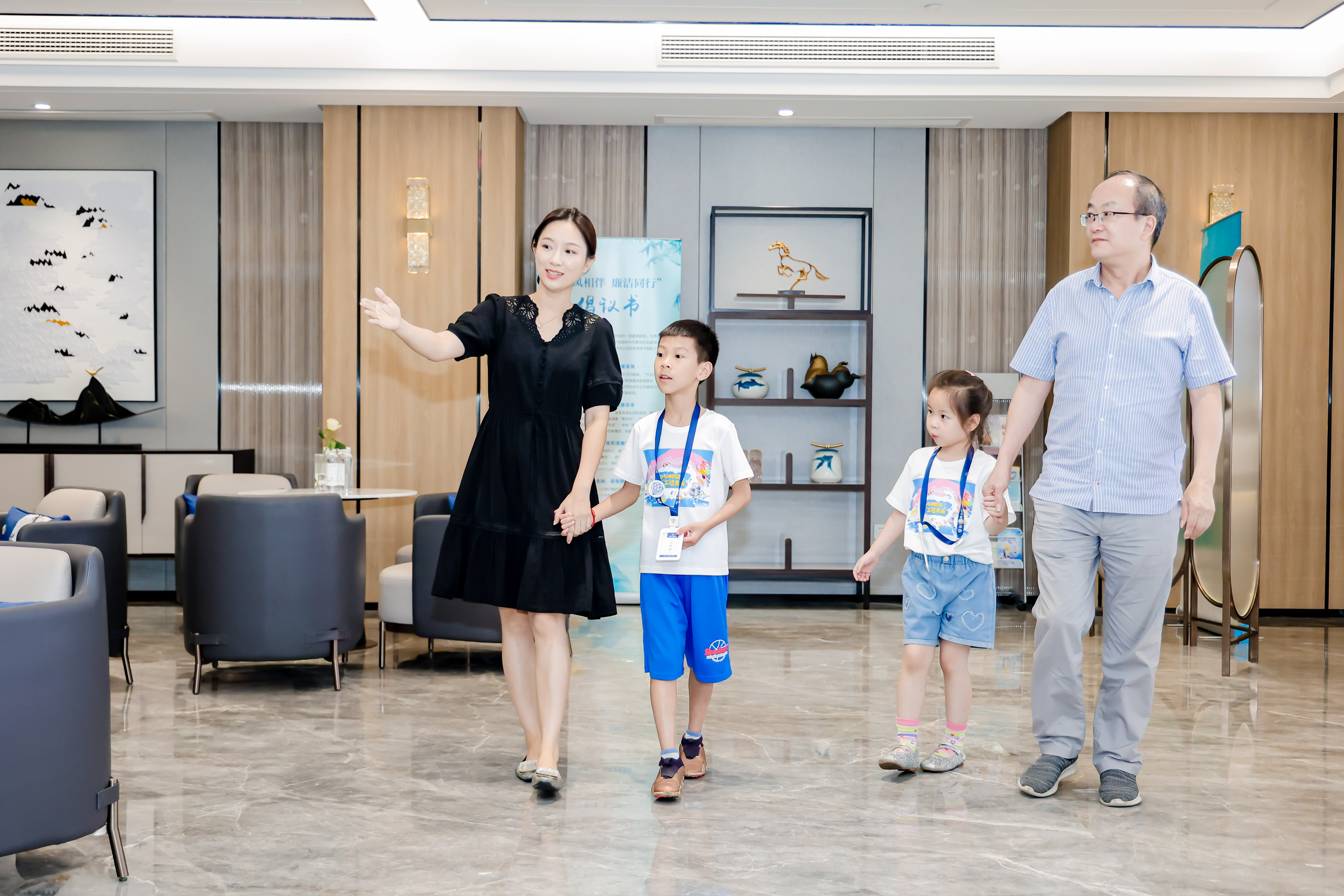 家人們正在參觀寬敞明亮、整潔、現(xiàn)代化的辦公環(huán)境